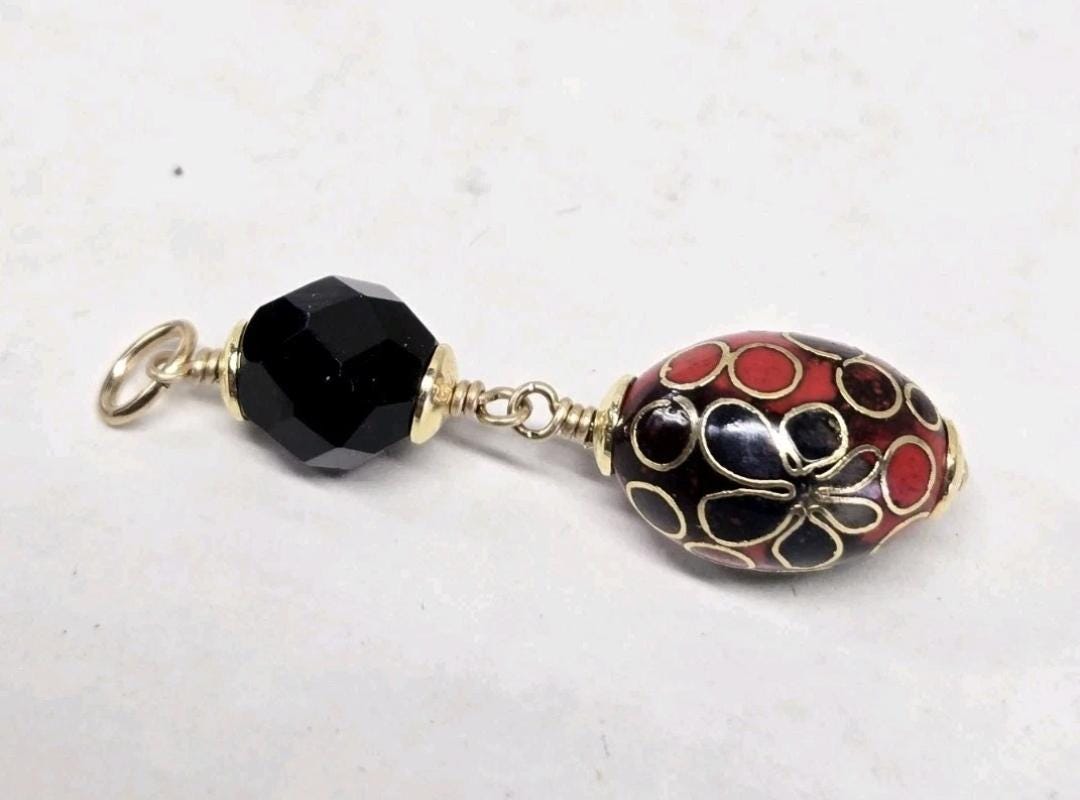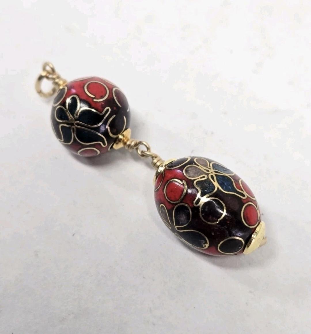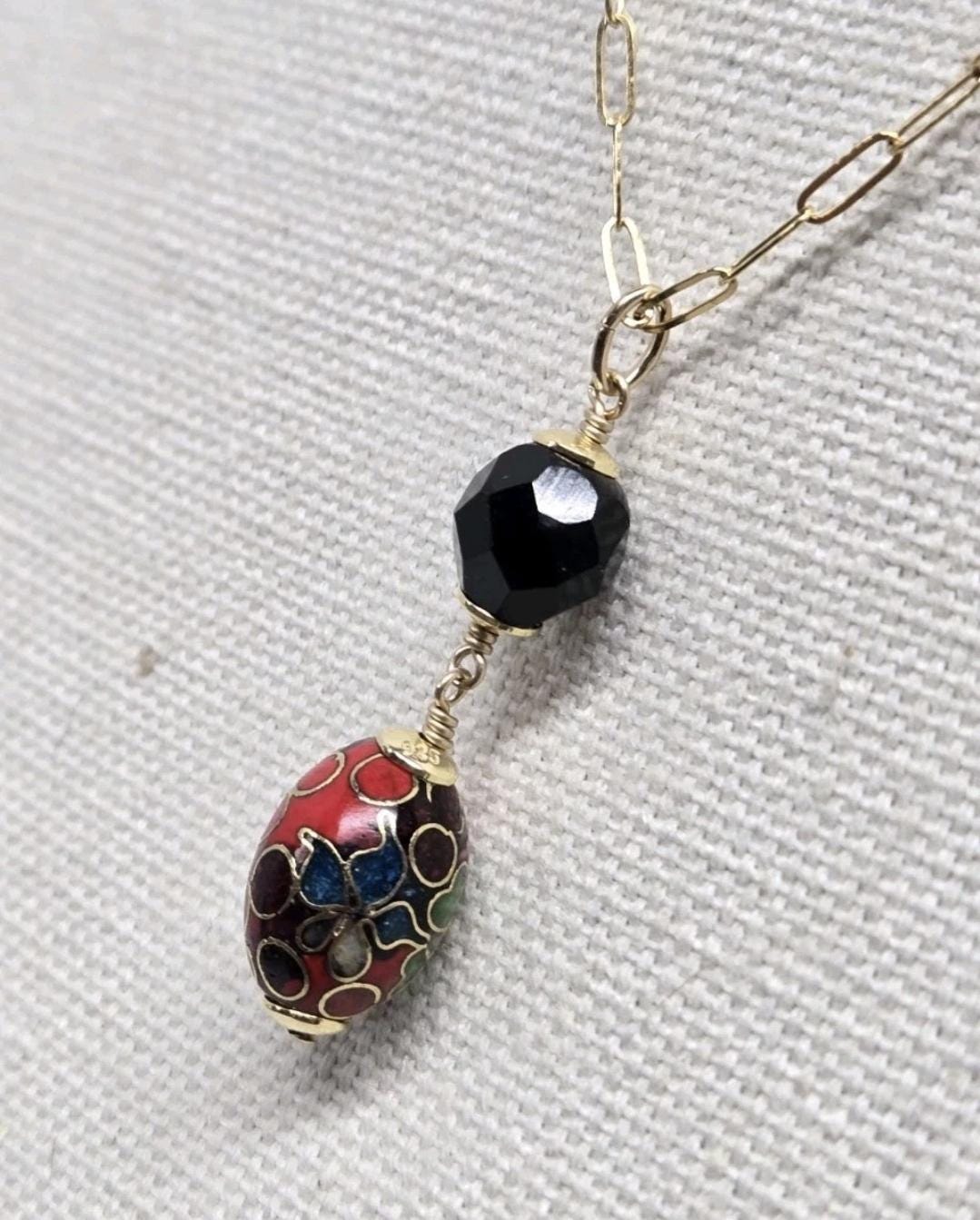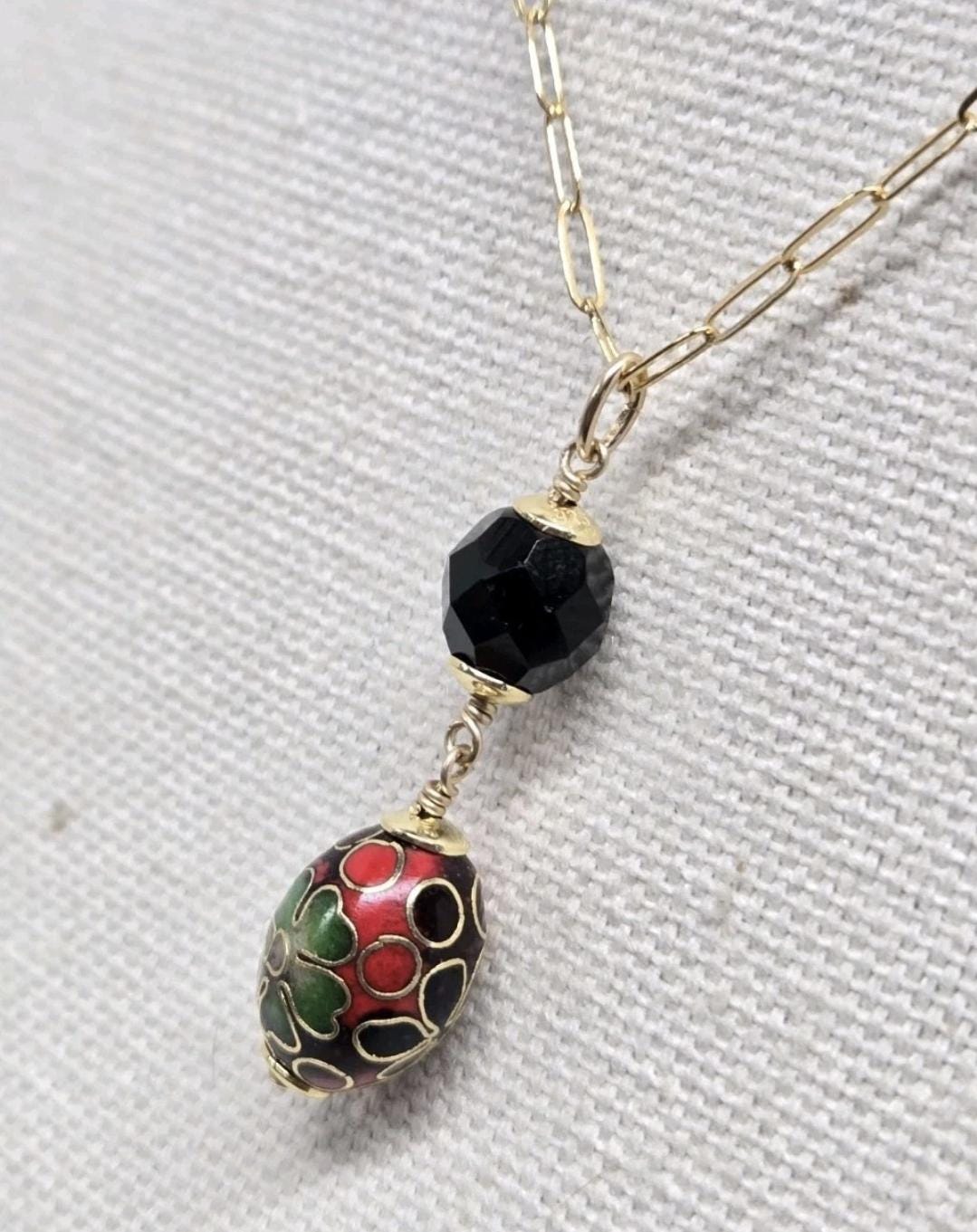 Beautiful enamel cloisonne Art Deco beads create this modern take on a drop pendant from genuine upcycled elements of the Art Deco Era.